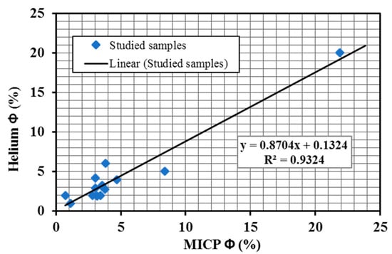 The cross-plot of Helium porosity (%) versus MICP porosity (%) for the studied samples.