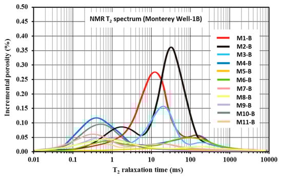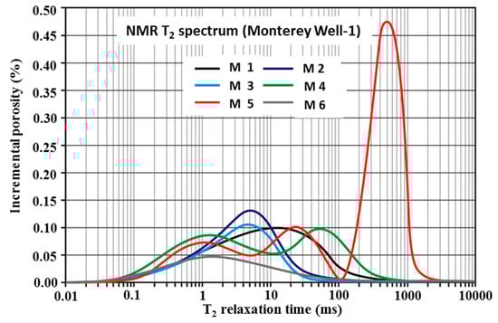 NMR T2 spectrum for Monterey shales (i.e., M1-B–M6-B) collected from Well 1B. Modified from Rivera [46].