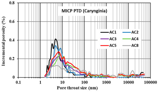 MICP pore throat size distribution (PTD) for Permian Carynginia shales.