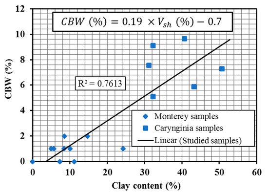 The cross-plot of clay bound water (CBW) (%) versus clay content (%) for studied shale samples.