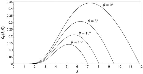 Figure 1 shows the curves of the power coefficient as a function of tip-speed ratio () and for some blade pitch angle () values. The maximum value of the power coefficient () is approximately 0.441, corresponding to , when the blade pitch angle is at its minimum ().