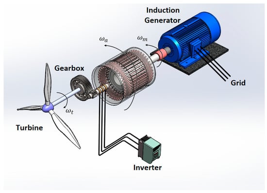 Considering that the speed of wind turbines is significantly lower than the rotating field speed required for generating voltage at the grid frequency, several topologies of wind turbines adopt the use of a gearbox. Its effect is to multiply speeds and as well to reduce torque. This component is also considered to compose the EFR-driven generation system as shown in Figure 2. The relationship between the turbine and EFR armature speed is shown in the following equation: