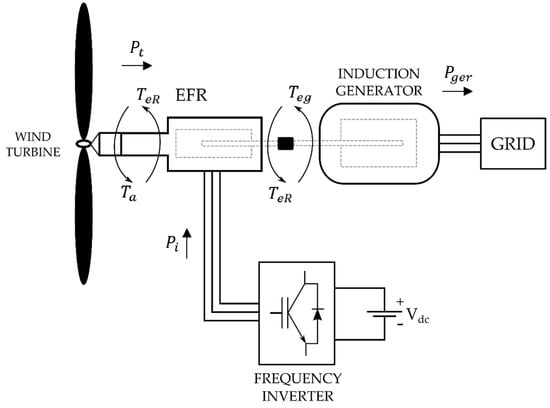 Following this trend, a new topology was recently developed to drive generators, aiming to avoid power electronic devices directly connected to the grid, and making possible the hybridization of the wind power source with another one. This system is named Electromagnetic Frequency Regulator (EFR) and consists of an induction machine with rotor in squirrel cage and a rotating armature endowed with a three-phase winding that may be fed by a secondary source [13,14]. Although the term “stator” is proper for induction machines, it will not be used here because this term suggests something stationary (from Latin). The authors of references [13,14] preferred to designate it as an asynchronous rotor because the other rotor would drive a synchronous machine and, therefore, would rotate at a synchronous speed. Since in this work it is not necessary to classify the parts in relation to a synchronous speed, since the adopted generator is an induction machine, the authors preferred to designate the parts of the EFR simply as armature (connected to the gearbox) and rotor (connected to the generator shaft). The main function of the EFR is to convert a variable speed imposed by the wind turbine to the armature in a desirable speed to be developed by the cage rotor.