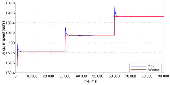 The proposed system was submitted to three steps of 1 m/s in wind speed, starting from a steady state of 8 m/s. Thus, at the end of the simulation, the induction generator will be at rated power. The simulation result for the rotor speed and the desired speed is shown in Figure 7.