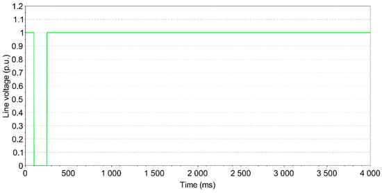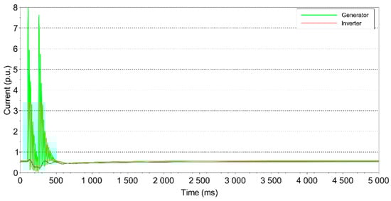 The currents of the induction generator and at the output of the inverter are both shown in Figure 19. As can be observed in this figure the resulting stator current of the generator during the simulated short-circuit is very high, if compared with corresponding steady-state value, whereas at the inverter, it does not happen. Another relevant aspect is that the maximum short-circuit current of the generator is almost 13 times the steady-state current, whereas the current in the inverter is only 20% higher than its steady-state value. Thus, it is unnecessary to switch off the inverter during the disturbance, as this overcurrent is compatible with the levels supported by actual devices. Therefore, extra protection for the inverter is not required, as by Rotor Side Converter (RSC) in a Doubly-Fed Induction Generator (DFIG).