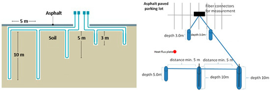 A theoretical maximum for the available heat energy amount in the asphalt-covered layer (Vtot = 0.5 m3) is 20,785 kJ ≈ 5.77 kWh when soil types are dry and ΔT = 18 °C (the annual maximum temperature of the depth is 22 °C and the lowest permitted temperature chosen for the soil is 4 °C).