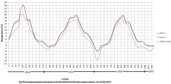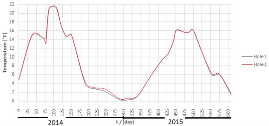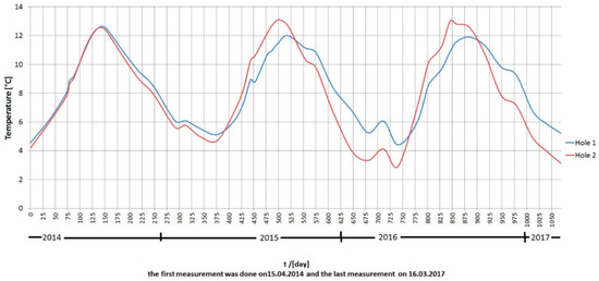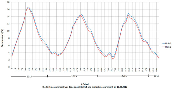 Figure 5) under the asphalt layer demonstrates that the seasonal temperature variation was about 13–14 °C. The lowest temperatures were monitored from January to April, when they varied from 2.4 °C to 4.8 °C. The highest temperatures were in August of each year. At this intermediate depth of 1.5 m, the temperatures were quite low during winter and at the beginning of spring. Once again, the data from both measurement holes are almost identical throughout the whole period of 2014–2017.