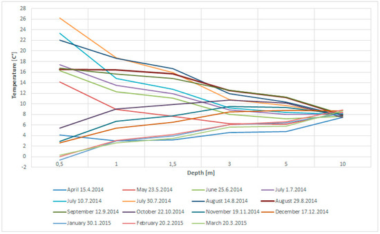 This stabilization of the temperature to 8 °C at a depth of 10 m, regardless of the season, was also noticed in the periods of April 2015–March 2016 and April 2016–March 2017.