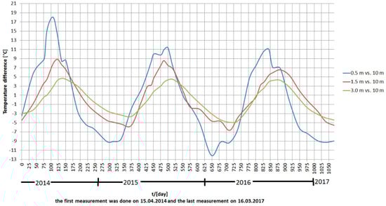 Figure 8 indicate the seasonal variation of the temperatures compared to the CST in different depths under the asphalt throughout the three-year study. It also shows the differences in the heat conduction speed between the studied layers. For example, it can be seen that the maximum temperature difference at 1.5 m occurred more than two weeks later than at 0.5 m. The variation in the temperature differences smoothen from the surface to the deeper layers. At a 0.5 m depth, the difference varies by even 30 °C, while at a 3.0 m depth the variation is less than 10 °C.