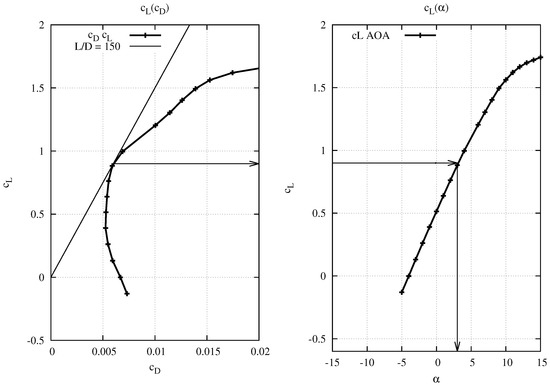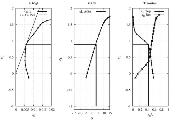 Wind energy [1] has been very successful over the past few years, with more than 50 GW newly added rated wind power each year. One important part in any design of wind turbines (WTs), especially for WT blades, is aerodynamics [2]. This consists of defining chord, twist, and appropriate 2D airfoil sections. From inviscid fluid mechanics, it is well known that design rules, if formulated in terms of circulation, only give expressions for (chord times the lift coefficient) [2]. As so-called profile losses can be estimated by 1.5 tip-speed-ratio/lift-to-drag [2], those with low drag are particularly interesting. From airplanes, laminar airfoils [3] are known and widely used to reduce fuel consumption during cruise flight, and it is tempting to use this kind of airfoil for WTs, as well. A so-called operating or design point () was found by constructing a tangent from the origin of the coordinate system to the curve to reach for maximum lift over drag ( L2D), (see Figure 1). Data calculated by Xfoil for the aerofoil profile are shown in Figure 1 and summarized in Table 1.