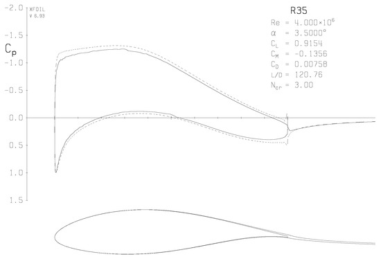The airfoil profile can be found at a radius of R = 35 m on the investigated WT rotor. Usually, a newly designed airfoil has to be tested in a wind tunnel. See [4] for an impressive example of high Reynolds number wind-tunnel testing, and a comparison with computational fluid dynamics (CFD). Panel codes like Xfoil, as well as genuine CFD codes like DLR-TAU [5], were used. Here, Reynolds number and inflow-turbulence levels were varied, and both effects could be simulated well. Furthermore, measured results agreed up to few percent in the lift-to-drag ratio.