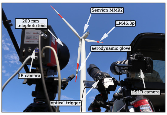 For the thermographic measurements performed by BIMAQ and DWGE, a cooled thermographic focal-plane-array detector from the manufacturer InfraTec (model ImageIR 8300) was used. The detector material is indium-antimonide. The pixels detector is sensitive between 2 and 5 , the dynamic range of the camera is 14 bits, and the integration time can be set between 1 and 20,000 . InfraTec specifies the noise-equivalent temperature difference (NETD) as less than 25 mK C. The camera was calibrated by several measurements of a black-body radiator at different temperatures. The nonuniformity of the individual pixels was compensated by a one-point correction immediately before the presented measurements. A 200 mm telephoto lens with an instantaneous field of view (IFOV) of 0.08 mrad was used. This resulted in a spatial resolution of 11.2 mm for the given measurement distance of 140 m. The thermographic camera was triggered by an optical trigger mechanism. This allows a drastic reduction of the amount of data, since images are only taken when a rotor blade is in the camera’s field of view. The subsequent evaluation of the thermographic data was done in Python. Figure 5 shows the experimental setup for the thermographic measurements at the Senvion WT.