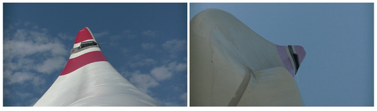 The second infrared camera setup was provided by the DLR and installed at a sufficient distance of approximately 80–85 m downstream of the WT mast to have an unobstructed view of the suction side of the aerodynamic glove at the minimum height above ground level (Figure 6). Thermal images taken shortly before the blade disappeared behind the mast offer the best possible spatial resolution at the given test conditions. Moreover, any distracting sunshine reflections can simply be avoided this way due to near vertical blade alignment.