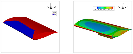 (Left): Estimated flow state regions from 3D transitional computational fluid dynamics (CFD), DLR -TAU code). (Blue) Laminar flow; (Red) fully turbulent flow. (Right): Static pressure coefficient.