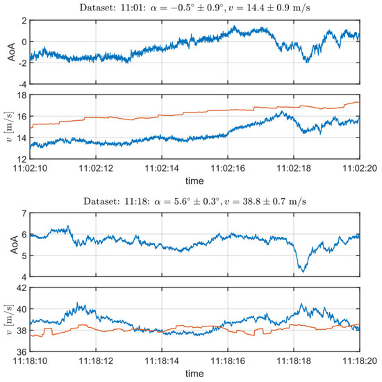 First, the inflow obtained by the five-hole probe is discussed. Due to the calibration of the probe in the wind tunnel of the University of Oldenburg, Germany, it was possible to obtain the inflow velocity together with the AOA. Figure 11 shows both quantities of the flow for the different operation states, respectively.