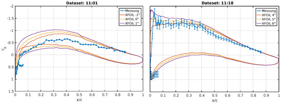 lift coefficient was calculated. Figure 12 shows the resulting distribution of for both operating states. For comparison, the CFD results of Xfoil calculations with a different AOA are also shown.