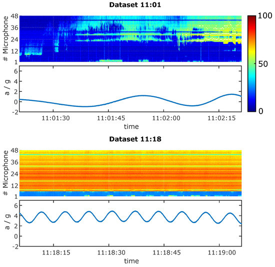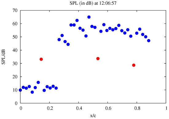 The main objective was a quantitative comparison of the detection of laminar–turbulent transition positions with two different methods: thermographic pictures and microphones. It is interesting to note that both methods agree in their results, within their limitations: Thermography takes the maximum temperature gradient as the location of transition, as Figure 14 and Figure 16 indicate. In contrast (see Figure 15), transition from SPL seems to be very sharp within one unit of distance (= 1/40 = 0.025 in terms of x/c).