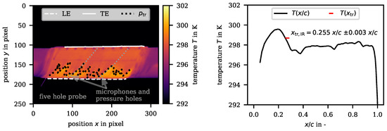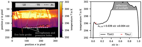 In Figure 16, the results for the turbine in regular operation mode are shown. Again, on the left, the thermographic image of the glove is shown, and on the right, surface temperature T is depicted as a function of chord-wise position . Besides the relative position of the transition in image , the visible LE and TE are shown. Due to a reflection of sunlight on the surface of the glove, the area toward the TE appears very warm. This area was not included in the image processing for the evaluation of the transition position. The span-wise average transition position for this measurement was , and the transition position at the location of the microphones was . From the microphone data, here, we obtained a slightly larger value of . Note that the spacing of the microphones was 0.02 (in x/c units).