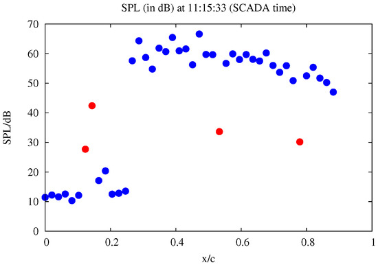 Development of SPL (in dB) vs. chord at 11:15:32 (SCADA time). If one discards outliners (in red) , may be deduced to .