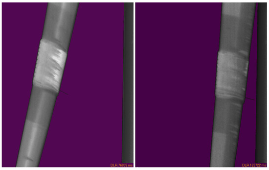 Thus, transition detection was based on analysis of single instantaneous thermal images of the rotating blade in the SU phase, indicating different stages of surface-temperature evolution from the initially quasi-uniform to a final local-equilibrium distribution. Image preprocessing here includes bad-pixel elimination, sky–background separation, and contrast enhancement. Figure 17 shows two typical thermal images obtained correspondingly at 11:22:27 and 11:23:13 (SCADA time) during a single WT run, accordingly preprocessed. The rotation direction here was from left to right, and the cold-sky background was colored maroon to enhance the visibility of the WT parts presented in graduations of gray. The vertical gray-scaled area on the right side of the picture represents the mast of the facility. The areas with laminar (warm/bright) and turbulent (cold/dark) boundary layers on the glove surface could clearly be distinguished in these pictures. Variations of the rotation rate (from 4.0 to 8.5 rpm) and of the blade pitch angle (from down to ) taking place between both these time instances during the SU phase caused the shifting of the transition region in the thereby documented time.