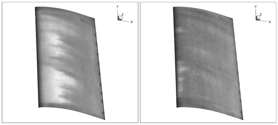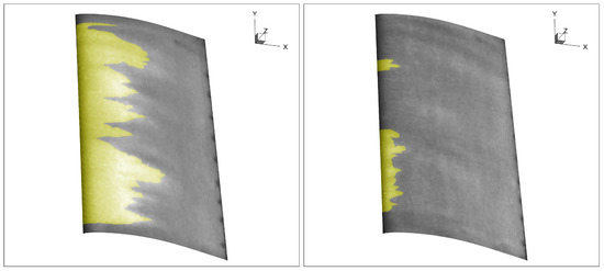 A thermographic measurement of the rotor-blade surface enables a noninvasive spatially resolved determination of the boundary-layer state. The method is called thermographic flow visualization. The measuring effect is based on an existing temperature difference between the flow and the rotor blade. The local surface temperature of the rotor blade depends on the local flow-related heat transfer coefficient. [20,21]. This results in a thermal fingerprint that correlates with the friction coefficient of the different flow areas of the boundary layer. Surface areas with laminar flow appear comparatively warmer in the thermographic image than surface areas with turbulent flow. This enables a distinction of the boundary layer flow areas and a localization of the laminar-turbulent transition, which can be realized by image processing algorithms [22,23]. Furthermore, advanced image processing methods enable the identification of flow separations [24].