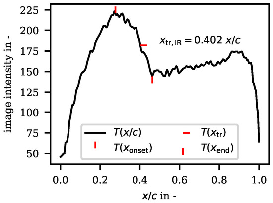 The localization of the laminar–turbulent transition is performed by an approximation of the chordwise temperature profile on the rotor blade surface with a Gaussian cumulative distribution function. The approximation allows the determination of the transition position with subpixel accuracy [22]. By taking into account the position of the aerodynamic glove in relation to the thermographic camera, the visible surface area could be assigned to its geometry. With the known measurement distance, the pitch angle, and the local twist angle, several coordinate transformations are performed to enable the calculation of the angle of aperture resulting in the imaging of the surface of the aerodynamic glove. Based on the transition position in the image, the position on the surface of the aerodynamic glove can be determined in world coordinates and, finally, the position relative to the chord-length () can be found [30].