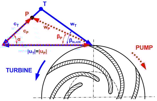 Due to the diffuser flow of fluid through the impeller during pump operation, the fluid flow is less curved than the angle of the impeller blades at the outlet of the impeller (βP < βBLADE), so the velocity triangle meets at point P. In the case of turbine operation, assuming a shock-free flow, the fluid must flow into the impeller at an identical angle to the angle of the impeller blade (βP = βBLADE). As indicated by Capurso et al. [15], this difference leads to an increase in the absolute tangential velocity component and, therefore, to a reduction in the work extracted by the runner. To avoid the shock of the fluid entering the impeller, the vectors of the velocity triangle of the turbine operation must be joined at point T. A solution comes from a presumption presented by Bláha et al.: Since the height of the velocity triangles is proportional to the flow (Q), and the absolute velocity of the fluid (c) is the total head (HT), the main parameters of the optimum pump turbine operation are as follows: QT > QP, HT > HP [16].