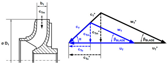 Based on the above assumption of the geometric similarity between the velocity triangles, a change in the operating parameters of PAT can be calculated according to Melichar [30]. The flow of the fluid through the inlet of the impeller at the nominal parameters QT (see Figure 2, the blue triangle) and at the changed parameters QT* (see Figure 2, the black triangle) comes from the following continuity equations: