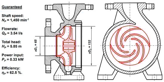 The abovementioned methodology was verified at the author’s workplace on a radial single stage centrifugal META series pump, manufactured in the Czech Republic by ISH Pumps, Olomouc. The pump’s scheme and parameters in pump mode, as provided by the manufacturer, are presented in Figure 3.