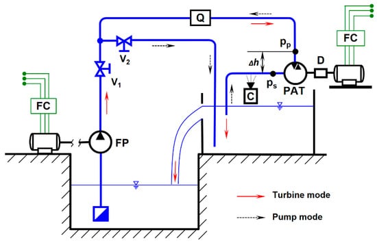 Hydraulic circuit scheme for testing turbines/pumps; Q, flowmeter; FP, feed pump; PAT, pump as turbine; V1, and V2, control valves; D, dynamometer; FC, frequency inverter; C, camcoder.