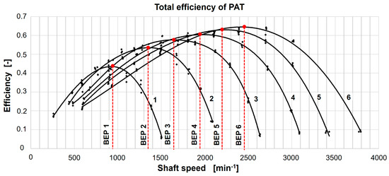 The aim of the experimental part of this study was to verify the behavior of PAT in general piping systems, allowing the generation of energy from a flowing liquid. The main experiment consisted of measuring performance parameters of PATs at six basic hydropower potentials (modes) that simulated changing pipeline system parameters. Constant hydropower potential was ensured by the constant speed of the feeding pump (FP), which means that six measurements were taken at six constant speed settings of the FP. During the measurements, PAT was gradually loaded from idle speed up to NT ≈ 500 min−1 in each mode. The performance characteristics were determinedfrom the measured values. Figure 5 presents the dependence of efficiency on shaft speed. Based on this dependence, the BEP was determined for each mode.