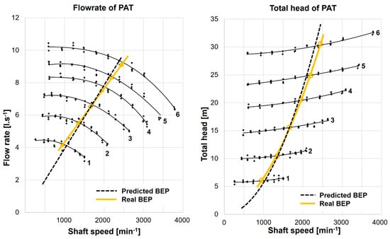In order to verify the applicability of the predictive relationships in Equations (6), (14), (15), and (18) and in the affine parabola in Equation (21), other necessary characteristics were determined from the measured values. Figure 6 presents the effects of flow rate and total head dependence on shaft speed. Values for the BEP (yellow curves) from Table 2 are marked here, as well as curves from the predictive calculations (dashed lines) according to Equations (6) and (15). The parameters measured in mode 3 were used as input values for the predictive calculations.