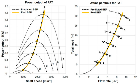 The characteristics presented in Figure 7 were generated in a similar way. These are the dependences of power output on speed and the affine parabola, including the measured values (yellow curve) and the calculated values (dashed line) for the BEP.