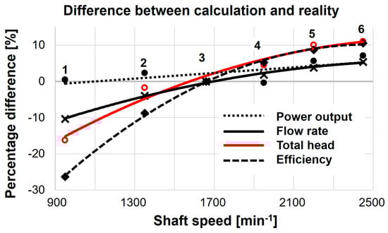 The graph in Figure 8 summarizes the final results of the study and serves to compare the experimentally measured values with the results of the calculated prediction of flow rate, Equation (6); total head, Equation (15); and power output, Equation (18) in relation to shaft speed.