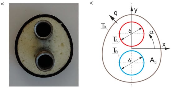 An example of a prototype (a) of a double pre-insulated, egg-shaped thermal insulation pipe made as part of the VIPSKILLS 2016-1-PL01-KA203-026152 project Erasmus+, and boundary conditions (b) adopted for calculating numerical heat losses in the adopted double heating networks.