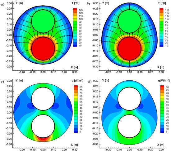 Optimization of the shape of thermal insulation can be based on the analysis of the heat flux density distribution in the cross-section of thermal insulation determined from Equation (3). For the following calculations (TS = 130 °C, TR = 55 °C), a cross-section of a pre-insulated double heating network with round thermal insulation with an external diameter D = 560 mm was assumed, in which the diameters of the supply and return ducts were equal to d = 291.1 mm with egg-shaped thermal insulation, whose cross-sectional area is the same as in the case of a twin pipe heating network with circular thermal insulation. Figure 2a–d shows the temperature fields (Figure 2a,b) and heat flux density (Figure 2c,d) for the standard shape of round thermal insulation (Figure 2a,c) and the proposed egg shape (Figure 2b,d) described by Equation (2). A characteristic feature of a typical twin pipe network is a large temperature gradient (Figure 2a) and a significant heat flux density (Figure 2c) under the supply line, which is caused by the small thickness of the thermal insulation at this location and the large temperature difference between the supply and ground [14].
