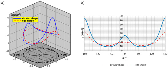 Distribution of the heat flux density at the boundary of the cross-section of the thermal insulation of round shape (blue solid line) and egg shape (red dotted line): (a) q = f(x,y); (b) q = f(α).