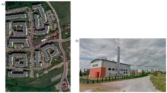 Location of the presented district heating network in Google Maps “satellite” view (a) and view of a gas-fired district heating plant (b) to which the heating network is connected.