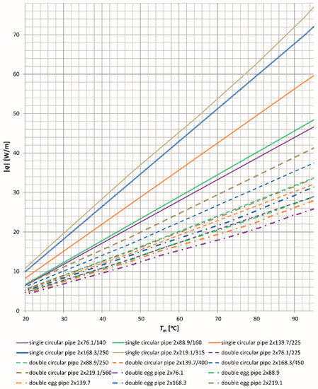 The geometry of a typical twin pipe heating network with round thermal insulation for variants B and C is presented in Table 2. The unit heat losses determined by the boundary element method for the selected diameters of pre-insulated single, double, circular, and egg-shaped thermal insulation networks depending on the average temperature of the heating medium (Tm = (TS + TR)/2) are shown in Figure 5. Heat losses for pipes pre-insulated with circular and egg-shaped thermal insulation depend linearly on the temperature Tm. As the average temperature of the heating medium and the diameter of the duct increase, the heat losses increase. Heat losses in pre-insulated double ducts with circular thermal insulation are on average 41% lower than in the case of single pre-insulated ducts, where, for d = 89.1 mm ducts, heat losses are lower by approximately 31%, while, for d = 219.1 mm ducts, they are lower by 46%. The difference in heat losses between a pre-insulated double duct with a circular thermal insulation for a d = 89.1 mm pipe is in accordance with the calculations in Reference [16].