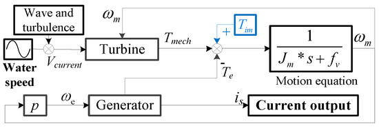 where is power coefficient, the water density, the cross-sectional area of the turbine, the tidal current velocity, and is mechanical torque and speed. The turbine drives an electrical generator. Considering the generator as a permanent magnet synchronous motor, the motion equation is given as: