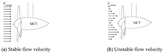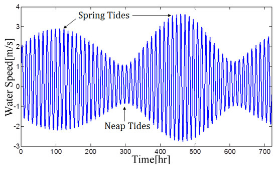 where stands for slowly time-varying torque, stands for abrupt change torque. The torque is caused by long-term tidal velocity, as shown in Figure 3. It provides one month water flow velocity variation curve—the velocity changes in a large range. The torque is caused by spatial velocity change, as shown in Figure 4. changes frequently due to unstable flow velocity, which results in strong interference.