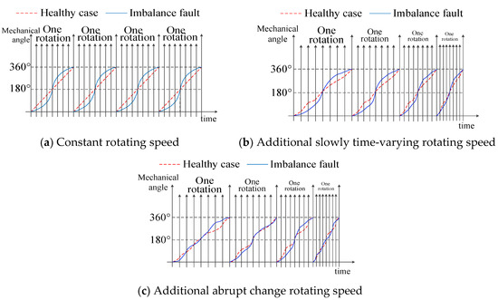 Figure 5 shows the mechanical phases in three cases: constant rotating speed, slowly time-varying rotating speed, and abrupt change rotating speed. In Figure 5a, imbalance faults can be accurately distinguished. However, when the rotating speed changes slowly, the imbalance fault feature frequency changes as shown in Figure 5b. When the rotating speed changes frequently, imbalance fault are not able to detect, features are partially or completely covered by interference, as shown in Figure 5c.