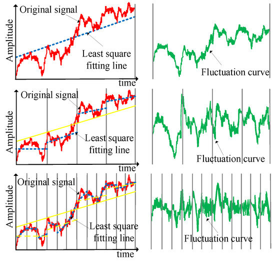 As shown in Figure 6, Least Square (LS) is used to eliminate the trend component according to the size of the windows. Different fluctuation curve is retained to highlight the fault degree. For 1P frequency, the length of window is selected as . After LS, the fluctuation curve of instantaneous frequency is obtained.