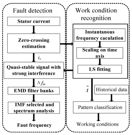 Condition monitoring provides continuous indications of components based on techniques, including vibration analysis, temperature, and acoustic emission analysis, among others [3]. Because of the limitations of underwater environment sensors, fault detection based on stator current has several advantages, since it is a non-invasive technique and avoids the use of additional sensors [4]. Regarding current-based detection methods, fault causes can be divided into two types: additive and multiplicative faults. Additive faults refer to the superposition of a pulse signal, a constant signal or a random small signal on the original normal signal [5], while multiplicative faults refer to signals with a certain frequency superimposed on the original normal signal [6]. For additive fault detection, time-domain statistical analysis can be used. A recursive principal component method can be applied to update the control limit adaptively to detect motor faults under unstable working conditions [7]. Multiplicative faults should be rather detected on the basis of energy frequency characteristics. Under stable working conditions, detections can be completed by frequency domain analysis. However, the magnitude of different frequency components changes with working conditions in practice [8]. Therefore, frequency domain analysis can be used in such conditions. Local feature detection, such as Short-Time Fourier Transforms (STFT) [9], Wavelet Transforms (WT) [10], and Hilbert-Huang transforms [11], can then be applied. STFT is used in [12] for blade crack detection of wind turbine to identify time-varying fault frequencies. In [13], motor current signature analysis is applied based on two sets of over complete wavelets; the gear fault-related component is highlighted under different operating conditions. In [14], SVD filtering combines the parameter estimation technique of rotation invariant signal to detect broken rotor bars under variable operating conditions. However, these methods identify the characteristic frequency, which amplitudes are very low in practice, and therefore may be partially or completely covered by the fundamental frequency and strong interference.