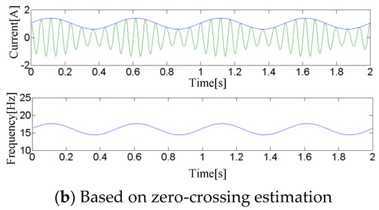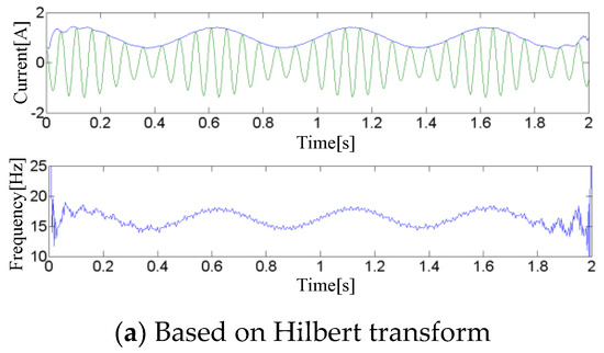 (2) Zero-crossing estimation can be easily implemented in the monitoring system, compared to STFT and WT. This method has good performance to estimate instantaneous frequency and can be used for long-term monitoring of current machine systems. However, this method has a low frequency resolution, not suitable for short-time signal processing.