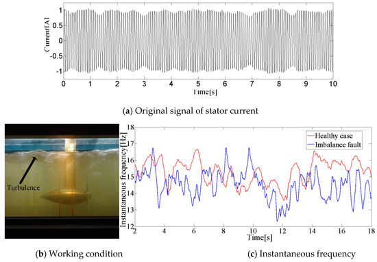 Figure 11 shows the stator current of MCT under a strong interference working condition [18]. One can note that when the velocity changes frequently, the collected waveforms fluctuate sharply. Under the condition of abrupt change flow velocity, both the original signal and the instantaneous frequency vary frequently with the change of flow velocity. The fault feature frequency is partially or completely covered by interference. The experimental phenomena coincide with the theoretical analysis, as shown in Equation (9).