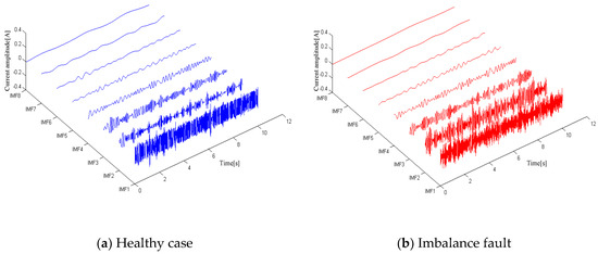 Figure 12 shows the detection results after an EMD-based filter bank. The original signal is decomposed into IMF1-IMF8. Noise or interference with similar frequencies is distributed to the same IMF, which can highlight fault feature frequency. After separating the interference component, the amplitude of characteristic frequency obtained is more accurate; this can help identify the fault degree. In Figure 12a, the maximum value of is 0.104 to IMF2. In Figure 12b, the maximum value of is 0.973 to IMF2.