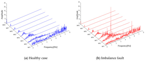 In Figure 13, it can be seen that the spectrum appears near the frequency of 1.875 Hz in IMF2, which corresponds to the characteristic frequency (1P frequency) of the imbalanced fault of MCT system. Several frequency components generated by strong interference are distributed on different IMFs by EMD, which greatly reduces the influence of interference and highlights the fault feature frequency.