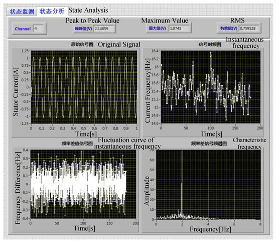 Figure 14 is the front panel of the block diagram program designed by LABVIEW. The proposed strategy is used in this monitoring system. The detection result of the MCT system is given, including short-term original signal, time-frequency spectrum, frequency difference by LS method and fault feature frequency. The last is the spectrum diagram of IMF, which has maximum value of . The input signal of the monitoring system is the stator current, and the output of the system is the working condition of the MCT and fault condition. The experimental results show that the proposed method can effectively eliminate strong interference and solve the problem that the frequency and amplitude of the operating parameters are partially or completely covered by interference.