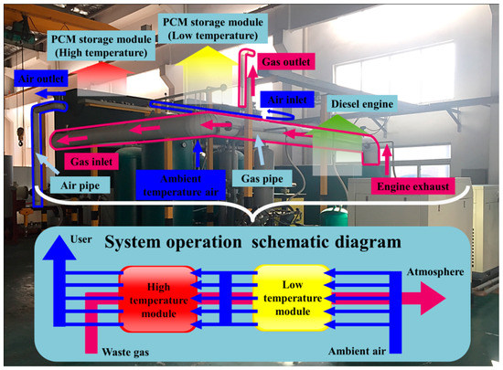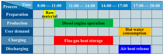 As shown in Figure 1, the demonstration system located in a manufacturing plant in Southern China was mainly composed of a diesel engine and a two-stage PCM storage module. Referring to the daily production scheme of the plant shown in Figure 2, by the end of the preparation process, the diesel engine started to run at a stable load from the warm-up state to drive the production line. After 5.5 h, the production ended and the generator ceased serving. The heat demand from the workers for washing and cleaning emerged about 0.5 h later and lasted 3 h. Referring to Figure 1, during the charging process, the flue gas exhausted by the engine entered the high-temperature storage module (HTM) and the low-temperature storage module (LTM) in sequence induced by the draft fan installed at the gas outlet of the LTM. Cascaded heat storage was performed according to the temperature gradient. During the discharging process, by the blower located at the air inlet of the LTM, ambient-temperature air flowed into the opposite direction and absorbed the heat stored in the two modules to supply thermal energy for heating water. The fan and blower operating under the rated power could ensure the smooth circulation of the HTF, and the corresponding consumed power and the influence of pressure drop caused by the flow resistance on the system efficiency evaluation were neglected in the current case study.